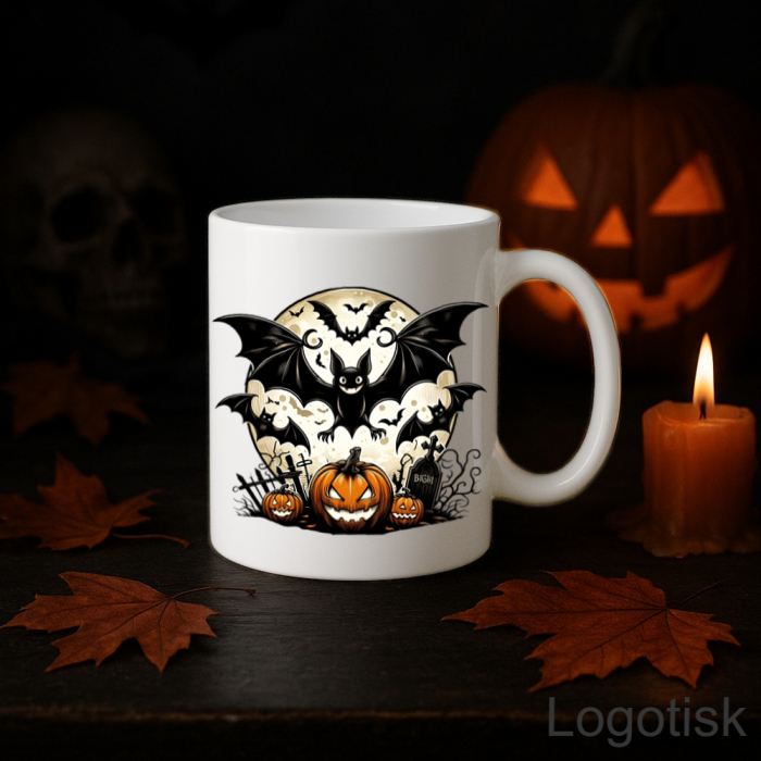 Keramický hrnek potisk s vtipným halloweenským motivem s NETOPÝREM. Motiv na přední straně, možnost dalšího dotisku druhé strany jménem, vaší fotkou, věnováním.