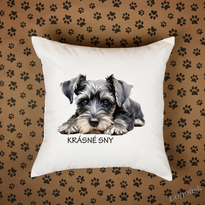 Polštářek - potisk, grafika pejsek Knírač malý - možnost změny našeho textu KRÁSNÉ SNY na vaše přání. Udělejte radost sobě, nebo milovníkům této rasy tímto originálním polštářkem.