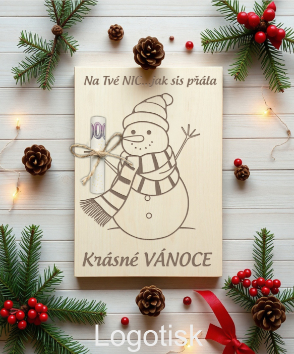 Jak udělat radost svým blízkým? Skvělou inspirací může být originální dřevěné vánoční přání s vypalovaným motivem sněhuláčka. Přání je navíc opatřeno šňůrkou, která umožňuje praktické připevnění bankovek. Pro ty, kdo chtějí darovat nejen radost, ale i něco více.